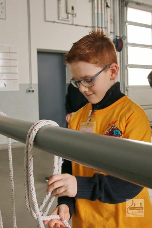 Zunächst mussten Schuhe gebunden werden. Dies ist den Leiterinnen der Kinderfeuerwehren eine Herzensangelegenheit. Sie möchten Kinder in die Jugendfeuerwehr übergeben, die ihre Schuhe binden können. Zwei Grundknoten der Feuerwehr: „Doppelte Ankerstich“ sowie der „Mastwurf“ wurden ebenfalls gefordert.