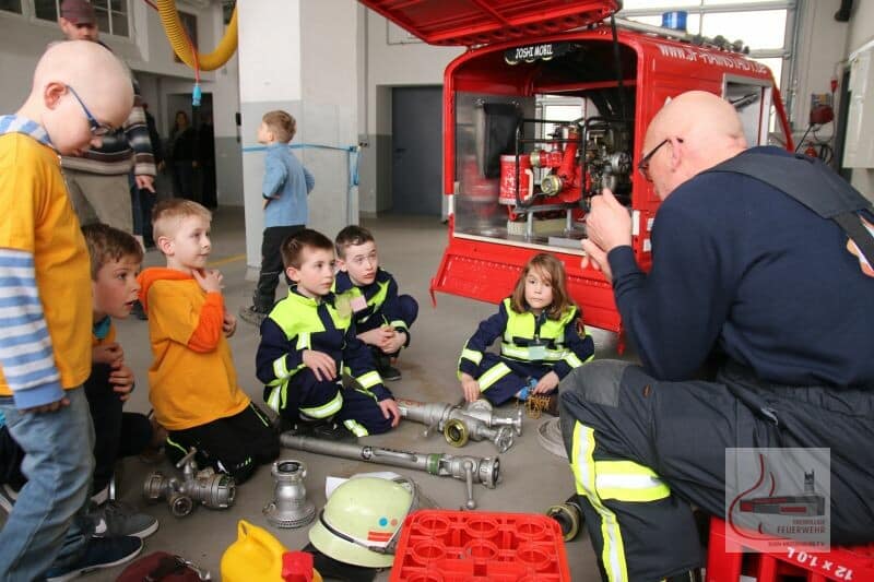 Andreas Hammann reiste mit dem Kinderlöschfahrzeug aus Hainstadt an. Er übernahm die Gerätekunde. Auf spielerische Art beschäftigten sich die Kinder mit den wichtigsten Geräten der Feuerwehr.