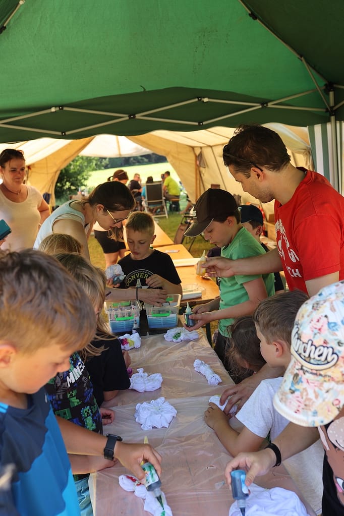 Am Samstag verbrachten die Teilnehmer*innen einen Tag gemeinsam auf dem Zeltplatz. Es wurden Tshirts gebatikt und verschiedene Spiele wie Wikinger Schach, Karten und Tischtennis gespielt.